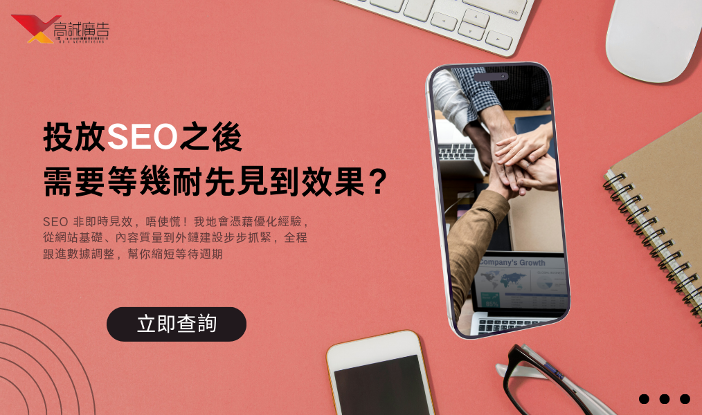 好多企業或者品牌,初次接觸SEO(搜尋引擎優化)時,最常問嘅問題之一就係:「我哋要等幾耐先見到成效?」相比起即時見效嘅Google廣告,SEO係一個長線投資項目,效果唔會一夜之間出現,但只要有耐性同正確策略,回報可以更加長遠同穩定。